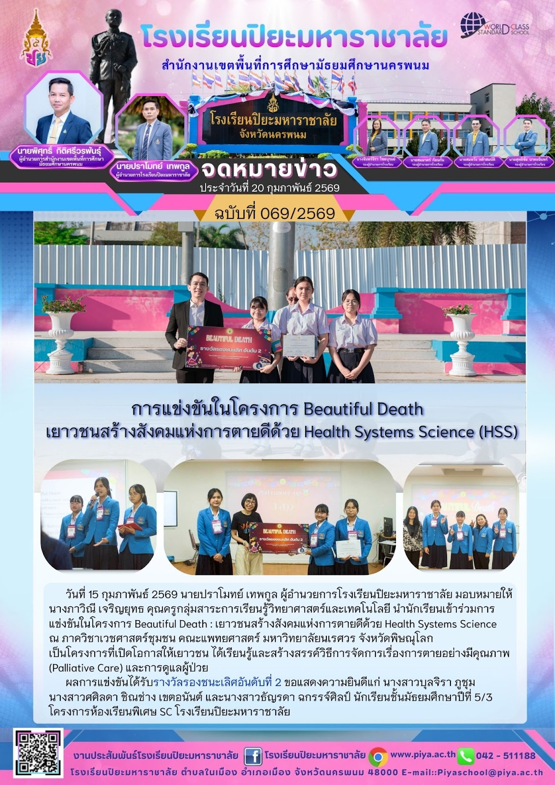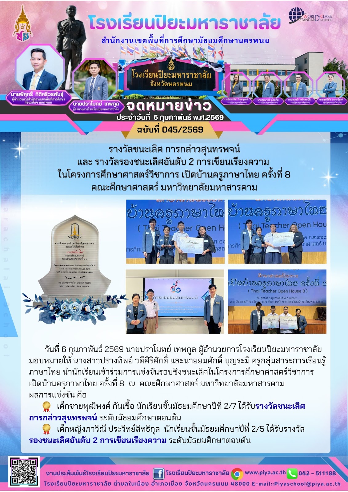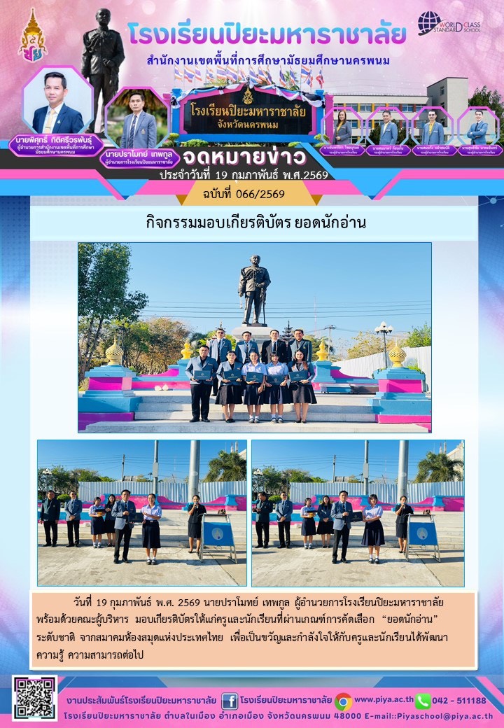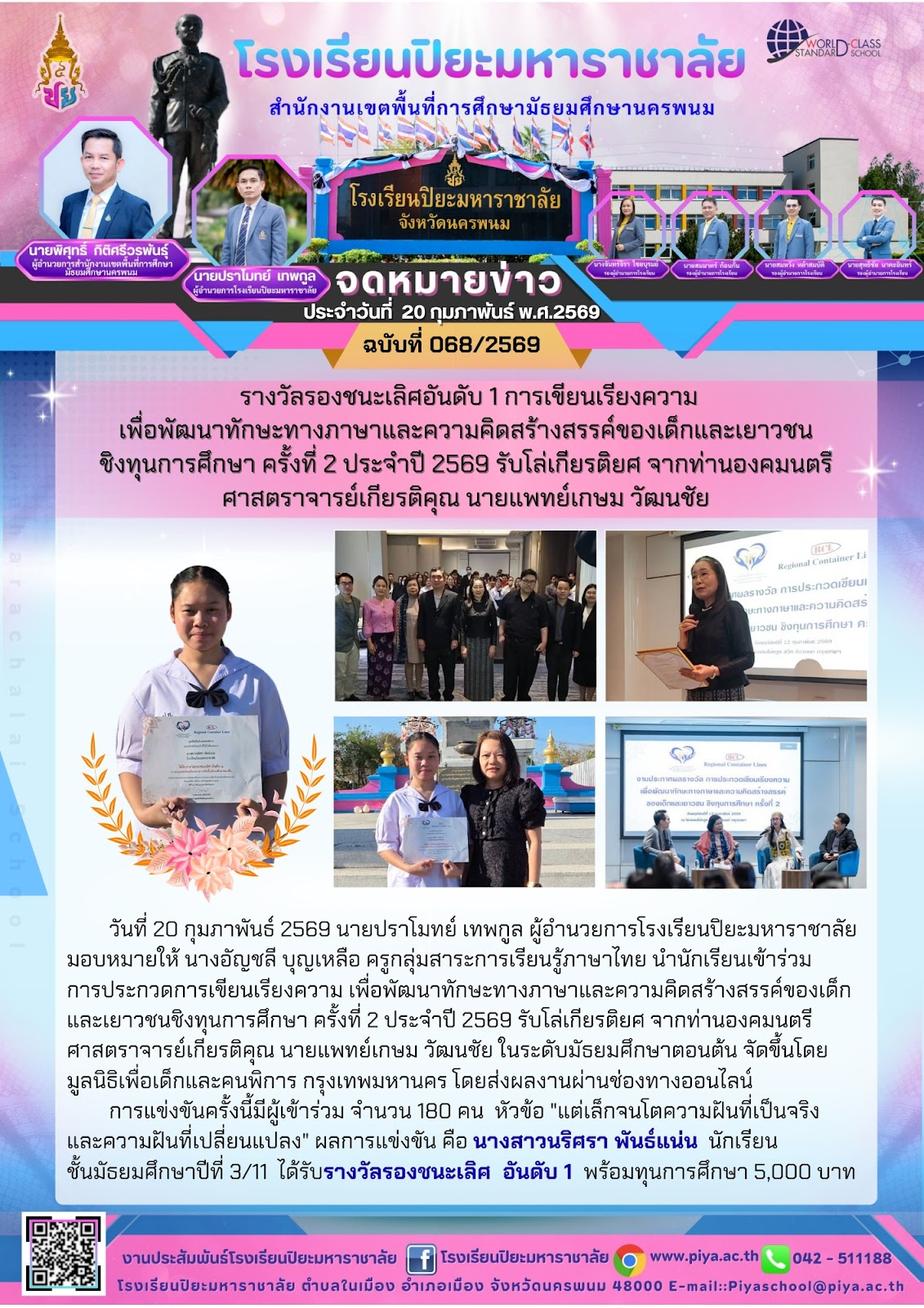 รางวัลรองชนะเลิศอันดับหนึ่งการเขียนเรียงความเพื่อพัฒนาทักษะทางภาษาและความคิดสร้างสรรค์ของเด็กและเยาวชนชิงทุนการศึกษาครั้งที่สองประจำปี 2569 รับโรคเกียรติยศจากองคมนตรีศาสตราจารย์เกียรติคุณนายแพทย์เกษม วัฒนชัย |