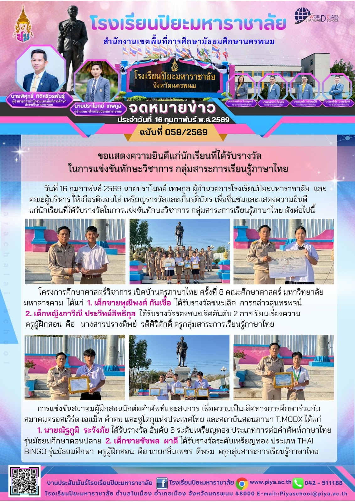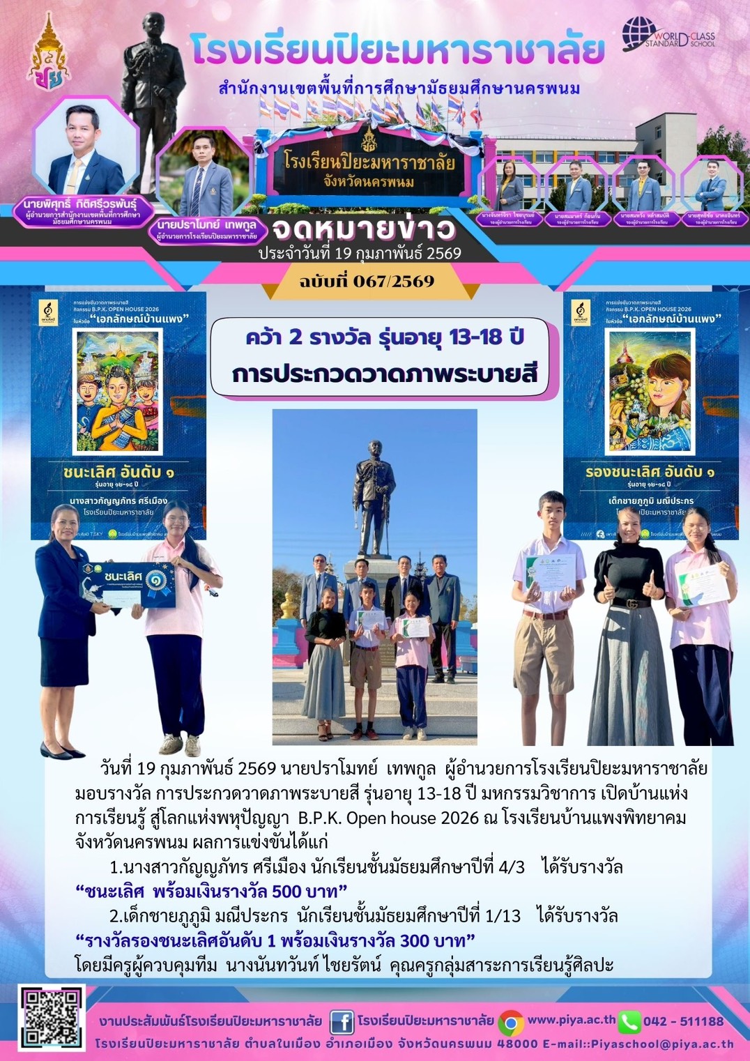 ขอแสดงความยินดีแก่นักเรียนที่ได้รับรางวัลวัฒนธรรมวินิต |