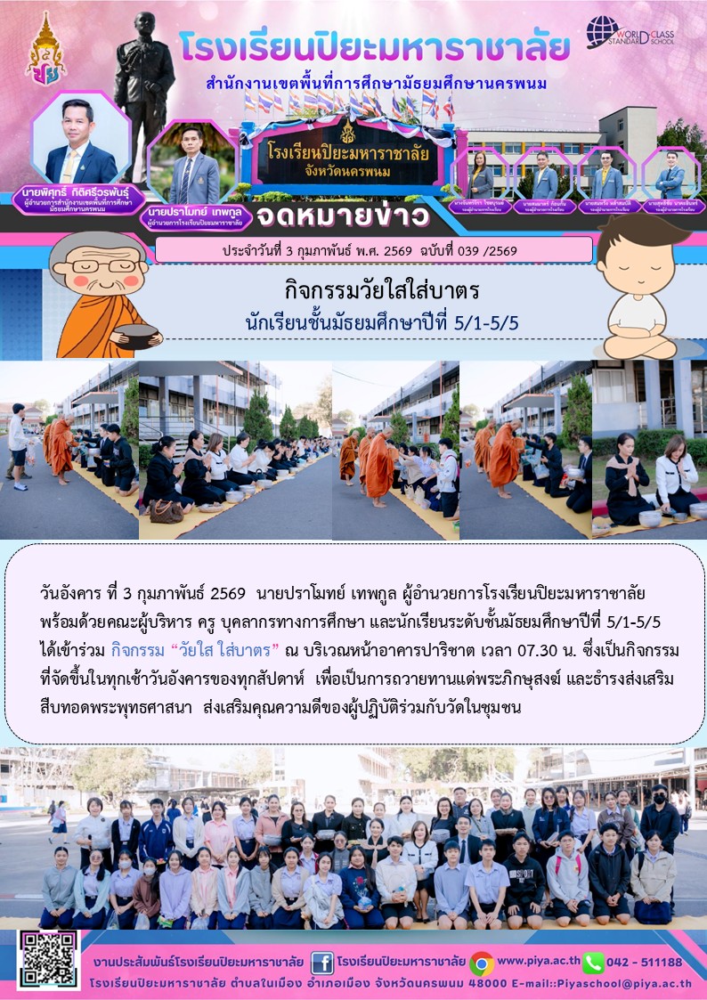 กิจกรรมวัยใสใส่บาตรนักเรียนชั้นมัธยมศึกษาปีที่ 2/12-3/3 |